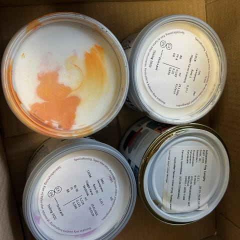 2 x halv fyldte bøtter vandafvisende gul murfarve i god stand.