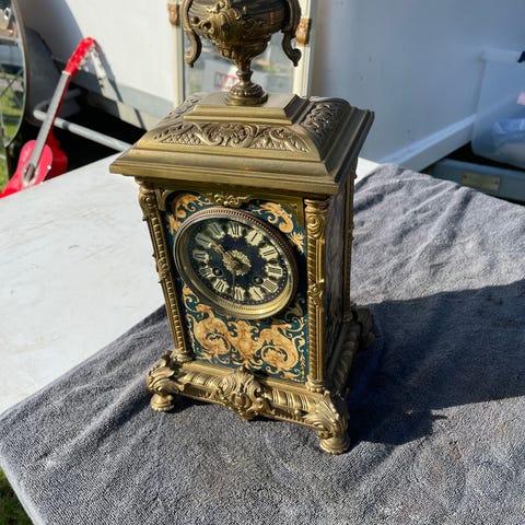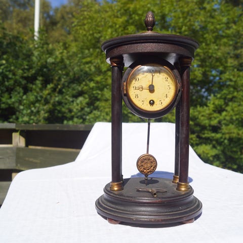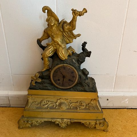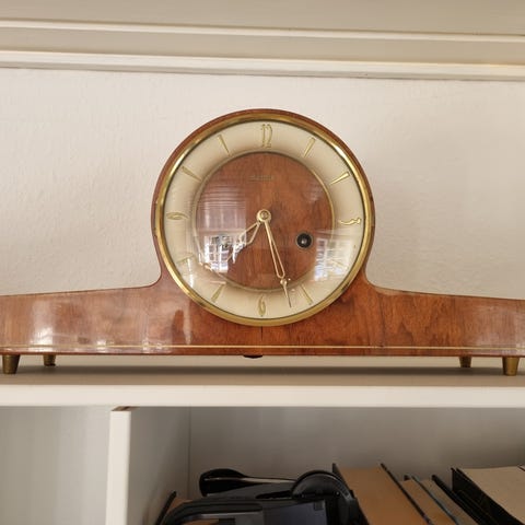 Gammelt konsolur med kabinet i egetræ. Virker som det skal, og har klokkeslag for hver halve time. Bredde 50 cm., højde 30 cm., og dybde 15 cm.