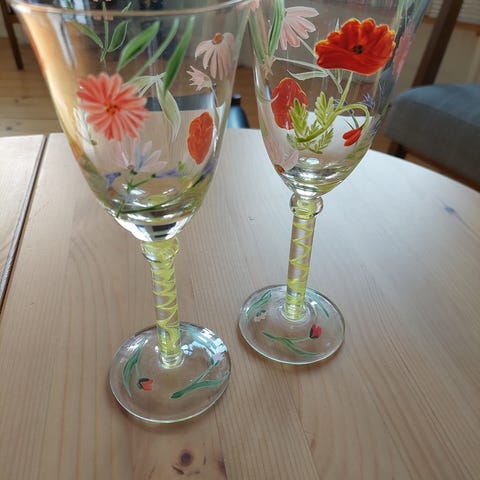 To dekorative håndmalede glas med sommerfugle og blomster.