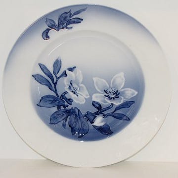 Designet er karakteriseret ved en delikat julerose-dekoration, inspireret af vinterblomstens elegante form og farver, og udformet med en diskret blågrå palet, typisk for B&G’s æstetik i perioden. Formen er klassisk og funktionel, med let opadbuede kanter og en diameter på ca. 15,5–16 cm, ideel til kage, dessert eller små serveringer.