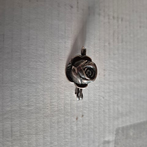 Den anden broche er en keramisk pion, fremstillet i slutningen af 1950’erne, hvor florale motiver og håndmalede overflader var populære i bijouteri.