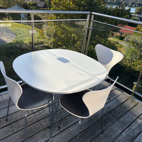 6 stk 7’ere stole med armlæn i sort skind som er meget velholdte og 1 stk Piet Hein Super Elipse bord med en hvid laminat bordplade med stål kant og ben af krom stål. Bordet fremstår i god stand med enkelte små ridser på bordpladen og på kanten. •Designer: Piet Hein •Producent: Fritz Hansen •Model: Super Elipse •Mål: Højde 70 / Bredde 240 / Dybde 120 Cm •Materialer: Hvid laminat bordplade med stål kant og ben af krom stål •Stand: Brugt Piet Hein Super Elipse bord 240x120 Cm.