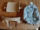 Stokke Tripp Trapp højstol babyindsats, med ryglæn og bøjle i natur og grå pude.