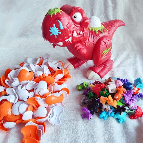 3 stk. haves. æg er kun åbnet for at se papir med oversigt med hvilken dino der er i selve pakke med slim.
