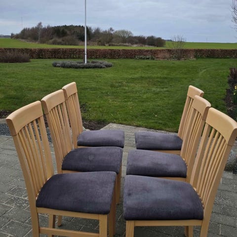 Fine stole fra 1950erne i massiv bøg, ombetrukket med zebra stof, I fin stand, med mindre brugsspor. Ingen husdyr og ingen rygning. Pris pr stk, har 6 stk