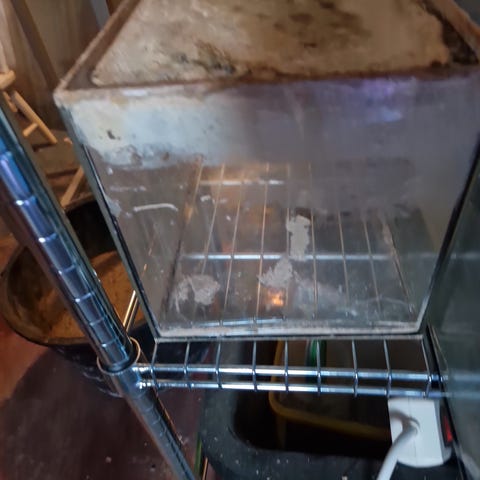 Har et akvarie, uden låg fordi vi brugte et tynd vævet net og havde mus i.
