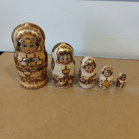 Andet, Mal-selv japanske trædukker. Sættet består af 4 træfigurer, pensel og 6 farver maling i plastbeholdere. Dukkerne måler 10,5 cm i højden. Da sættet har stået i nogen tid, garanteres ikke for malingen. Derfor sælges sættet for kun kr. 150,- i den originale emballage med alt originalt indhold.