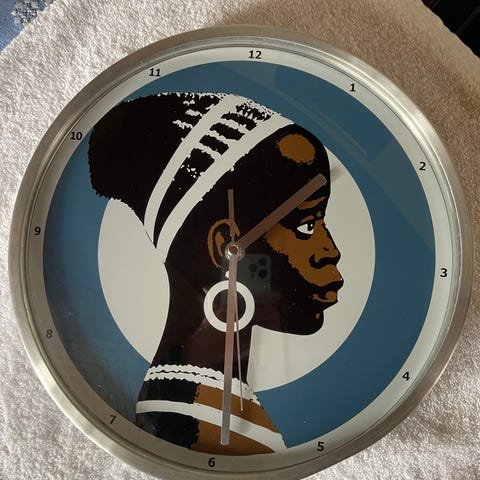 Retro vægur med Cirkel Pigen (fra Brugsen). Samleobjekt. Diameter 30 cm, 3 cm dybt. Aluminium uden front/glas (er “født” uden front). Løbende sekundviser.