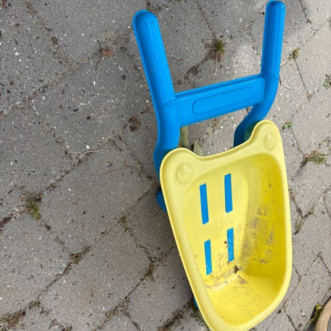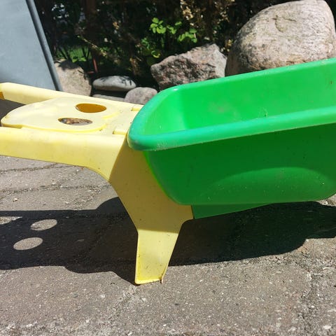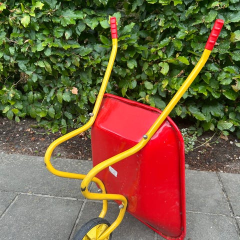 Lille fin lyserød og hvid trillebør af plastik til de yngste børn.