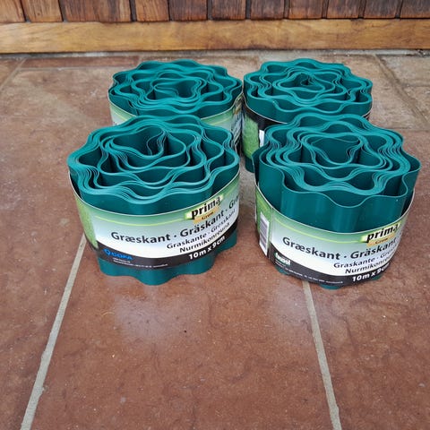 3 hele ruller og en rest i grøn plast fra bla. Biltema: 15 cm høje og 9 meter lange.