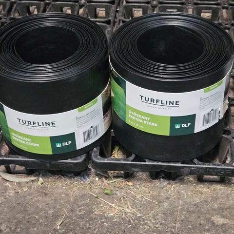 2 ruller i sort plast fra Turfline: 9cm høje og 9 meter lange.