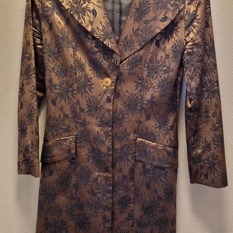 Ubrugt lang jakke/frakke i solgul stof med blomster.længden er knælang .lynlås foran .hætte.noget neopren lignende stofkan sendes.