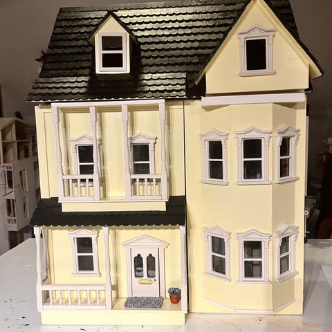 Komplet dukke hus med trapper, tapet, gulve og meget mere, der er trukket strøm i det