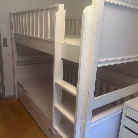 Virkelig fin og solid køjeseng, der kan bruges samlet som en køjeseng eller som 2 individuelle senge. Der medfølger kun meder til den ene seng.