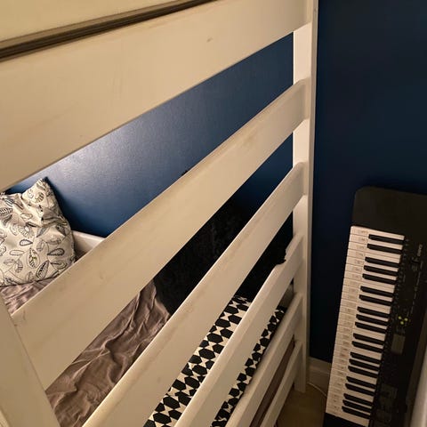 Almindelige brugsspor med lidt malingslid på kanter fx ved stigen. Vi har savet et hak i det ene sengeben, for at få plads ved en radiator (se billede), som evt kan vendes ind mod væggen.