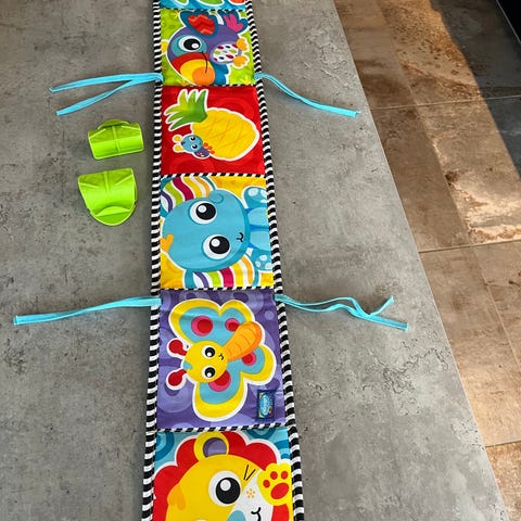 Sjovt Playgro aktivitetslegetøj i blå, grøn, rød og lilla som forstiller en hammer.