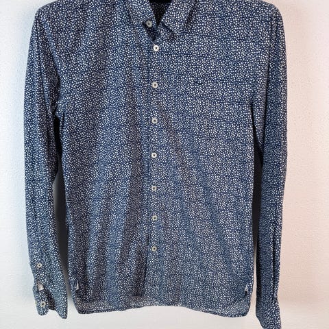 Ny og ubrugt herreskjorte LFTMAN mærket str M /40. Kinaflip hvid med marineblå prikker klassisk (bomuld)