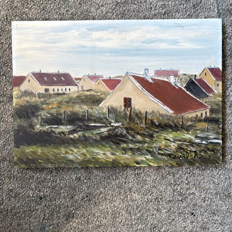 Fint maleri af Renal Bache afdød kunstner fra Ålborg. Rævegrav i Himmerland. 45 x 65 cm. Flotte farver.