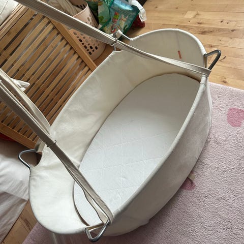 Til salg er et komplet Slyngevugge-sæt i fremragende stand, kun brugt til ét barn i et røg- og dyrefrit hjem. Alt er næsten som nyt og inkluderer: