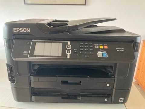 Printer fra Epson i modellen Stylus SX405. Virkede fint da den blev sat til opbevaring. Der har været strømstik i og den tænder stadig, dog trænger den til nye blækpatroner.