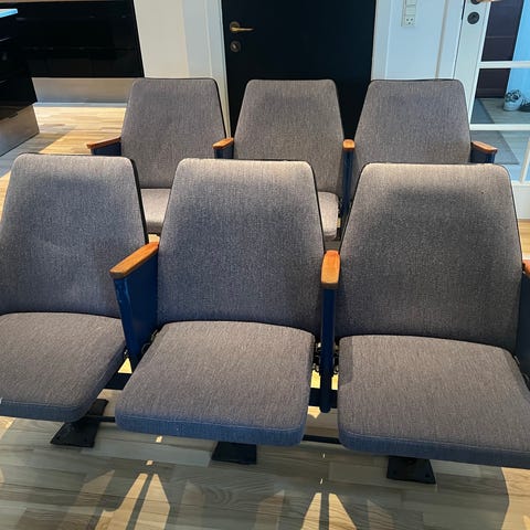 Biografstole fra Falkoner Teatret på Frederiksberg. Et stykke af Københavns historie. Stolene er fra 1958 i originalt betræk, samt originale række-og sædenumre. Stolene sidder sammen og er monteret på en plade. Kan klappes op. Naturlige brugsspor grundet alder, men i flot stand. Står på Christianshavn.