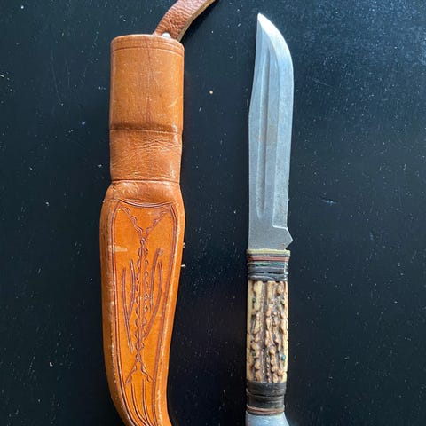 Jagtkniv, Kniv på hjortefod med læderskede 21 cm kr 325