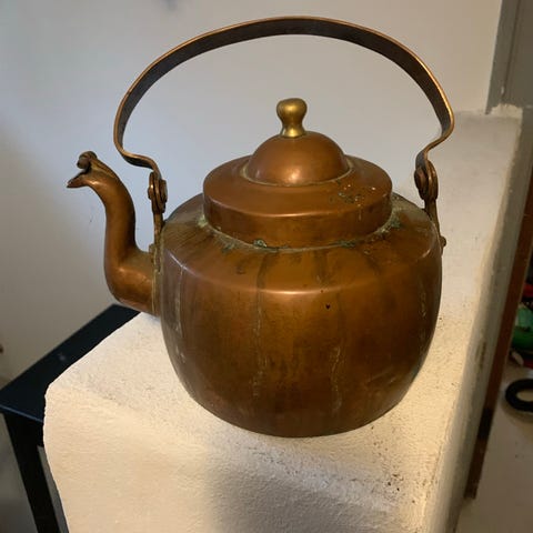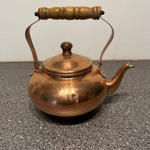 Vintage kobber tekande med træhåndtag. Denne tekande er fremstillet i kobber og har et unikt design med et elegant træhåndtag. Ideel som en dekorativ genstand i hjemmet.