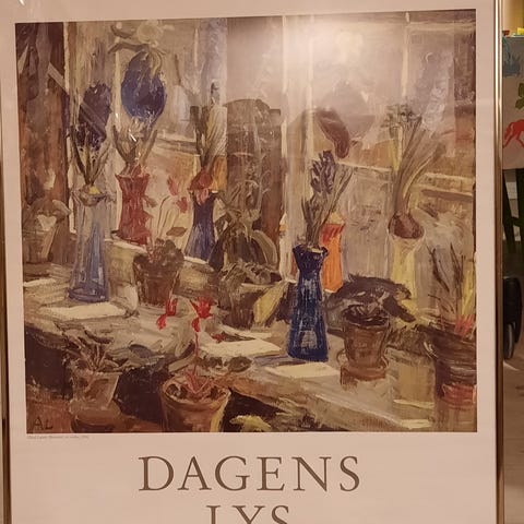 Plakat med Lars Syberg (porcelæn/kopper, tallerkener og fade) i hvid ramme med glas (ikke plexiglas). Fra Fåborg Museum 2003.