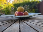 Super flot glasfad uden skader, ballance fint i sine asymmetriske længder og står solidt med frugt eller andet indhold.