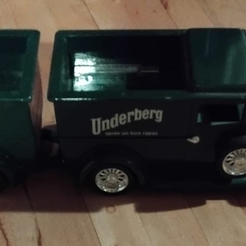 Flot underberg bil med anhænger, ølbrik i metal og patronhylster sælges