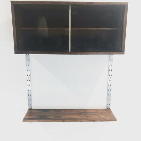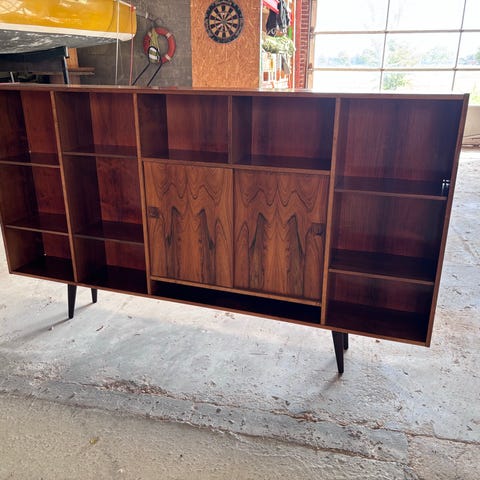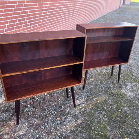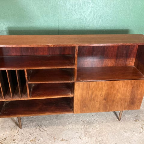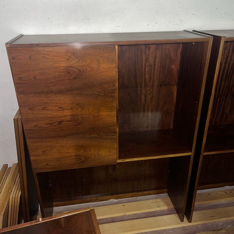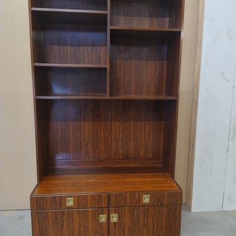 Et reolsystem, delt i over- og underdel, sælges. Det er i palisander, der godt kan trænge til en mindre slibning.