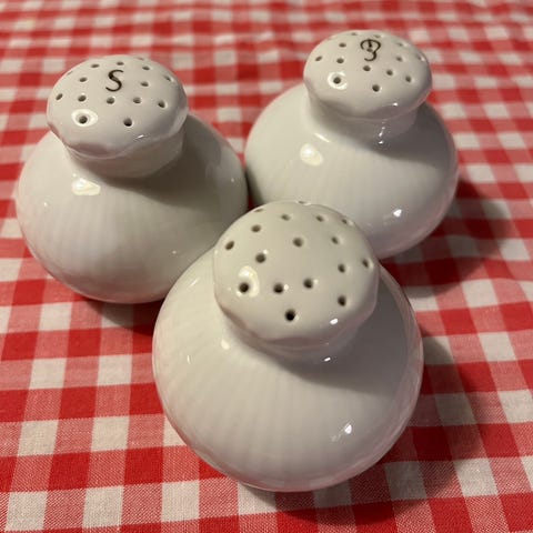 Salt/peberbøsse nr 467 med en lille revne, som ikke er gået igennem glasuren. Brugbar og med uoriginal prop, men den originale prop haves.