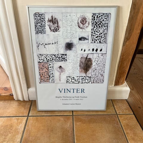 Fin ældre plakat for udstilling om Radering, arbejds proces og resultat på Vejle Kunstmuseum 31 august - 20 oktober 1974. Plakaten er i en solid aluminiumsramme i sort farve