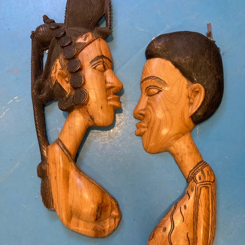 2 træfigurer skåret af Sigurd Porse. Lille figur 18 cm: 150 kr. Stor figur 23 cm: 125kr.
