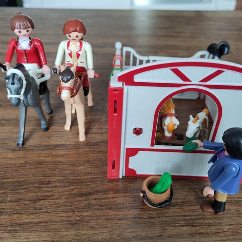 en Pony med rytter, hertil et gul hegn, hestedækken og en børste.