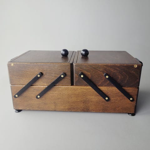 Handskeæske i læder med messingbeslag. Harmonikaåbning. Indeholder fin handske ekspander i ben. Foret med blåt silke og mørk blå velour.