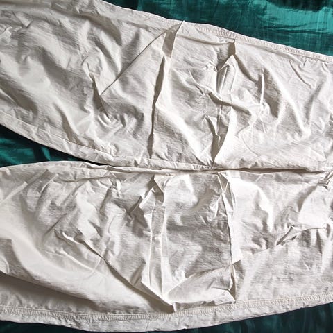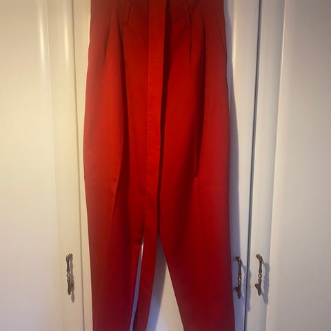Bukser i smidig satin med let glans. Bukserne har høj talje med beklædt elastik og diskrete lommer i siderne. Læg foroven, som giver de lige, vide ben ekstra volumen.