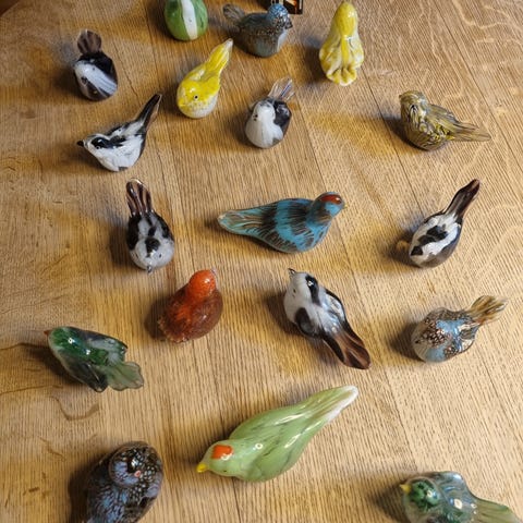 Små, fine glasfugle, evt. til dukkehus. Ligner kakaduer. En voksen og tre unger.