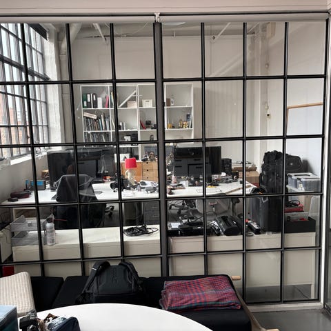 Støbejerns vindue fra gammel belgisk chokolade fabrik konverteret om til stort spejl.