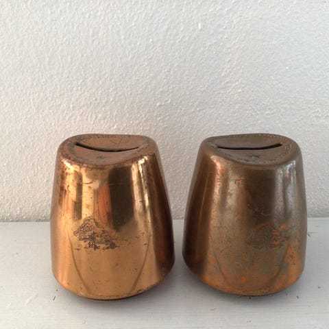 Sparebøsse i kobber fra Den sjællandske Bondestands Sparekasse. Logoer på begge sider. Ingen nøgle. Højde 8cm. har to små bitte buler men er ellers pæn.