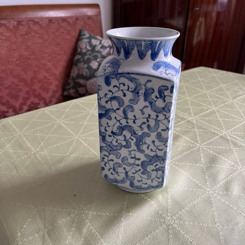 Krus med låg, fremstillet i Kina (China) måler i højde 14 cm med låg 10 cm uden, diameter er 8,5 cm