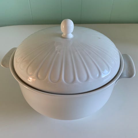 Suppe terrin med låg, dekoreret med blomster i flere farver. Skålen har to håndtag og en åbning i låget til ske. Velegnet af suppe eller sammenkogt ret ved måltider.