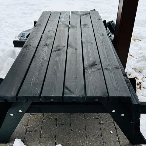 Udendørs picnicbord med bænk i træ og metal
