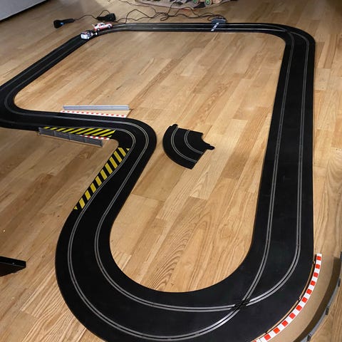 Fin racerbane fra Scalextric med ekstra special bil til hop, uden kryds men bro i stedet. Den ene bil trænger til et service.