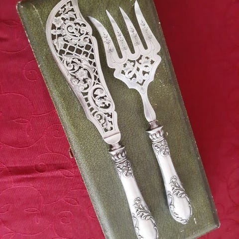Fiske bestik for de kræsne. Fra 1930-1940’erne. Sølv, 2 tårnet. Leveres eller afhentes i pudset stand.