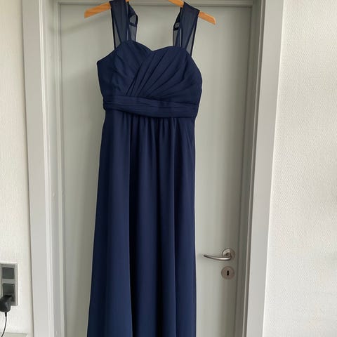 Kjolen er draperet på øverste del både foran og bagpå. Brede stropper og lynlås i venstre side. Længde fra øverste det af stroppen og ned ca. 112 cm.