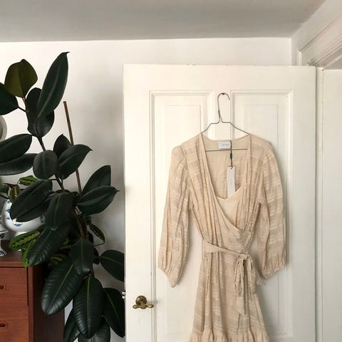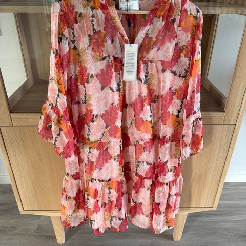 Neo noir smuk gul kjole str S. Smukt mønster. Åben I hals . Knappes fortil. Lynlås i siden. Fin flæse ved håndled med knapper. Foret. Længde 90 cm