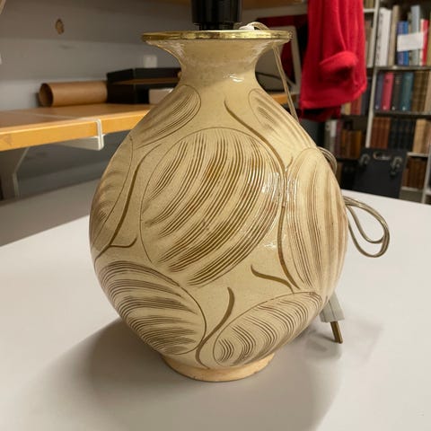 Lampe fra 1920erne i spættet grøn/gullig og okker glasur, fra Herman Kahler værkstedet.