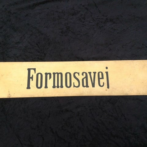 Skiltet er lavet af træ, og måler 60,5 x 12 cm