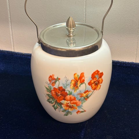 Smukke vintage kiksespande med flotte håndmalede motiver. Lågene trænger til en pudsning, men ellers er de i fin stand.